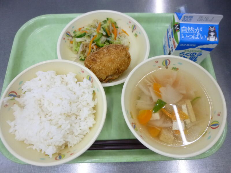 白菜に大根、人参、長ねぎなど冬が旬の野菜がたっぷり入った味噌汁は具だくさんで栄養満点です。また、大根は天草産、人参や白菜は熊本県産のものを使っています。地元の旬の食べものを味わいましょう。
