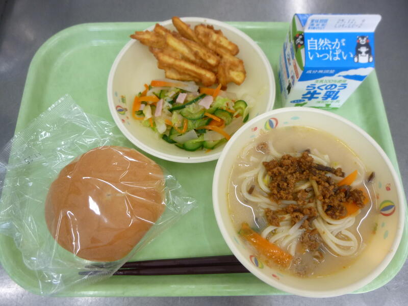 今日は姫戸小給食王の6年生のリクエストメニュー「坦々麺」です。野菜も肉味噌もたっぷりです。また、「がねあげ」は天草の郷土料理の一つです。旬のさつまいもを使った天ぷらは、その形がカニ=ガネに似ていることから、この名がつきました。
