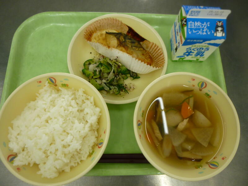☆ご飯 ☆牛乳 ☆けんちん汁 ☆サバのごま味噌焼き ☆ゆかりあえ