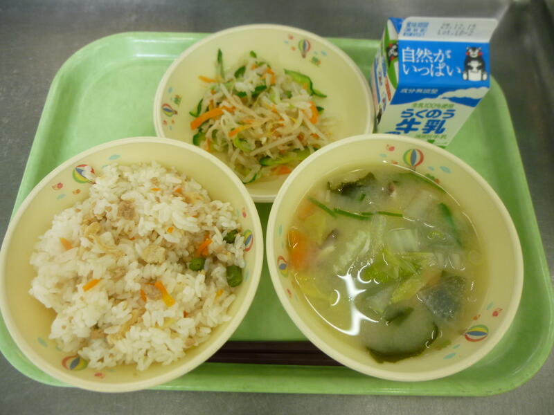 ☆こぎつねご飯 ☆牛乳 ☆冬野菜の味噌汁 ☆切り干し大根のあえもの
