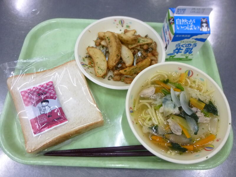 豆が入っていますが、人気のメニュー「青のりポテトビーンズ」。じゃがいもといりこ、大豆を素揚げして、青のりや塩で味つけしています。「大豆サラダの豆は苦手ですが、これは食べれます!」と笑顔で教えてくれる児童もいました。色々な料理で使うことで、苦手な食べものへの意識がちょっと変わってくれると嬉しいです。