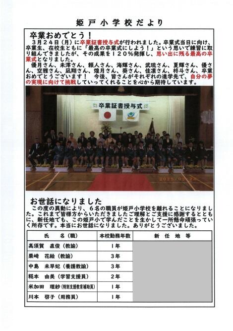 保護者の皆様、また、地域の皆様におかれましても、これまで同様、子供たちを励まし、支えていただきますようよろしくお願いします。