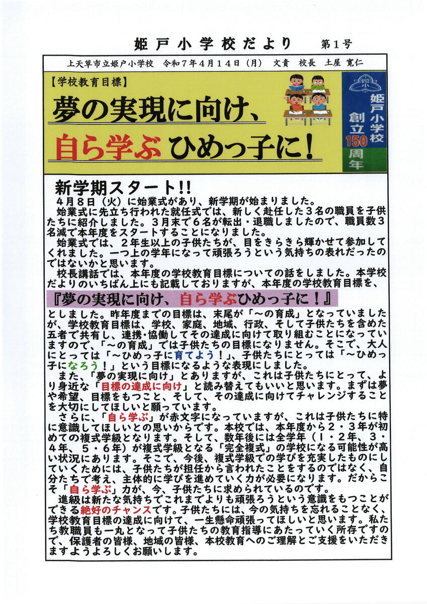 これから1年間、学校教育目標とひめっ子合言葉を常に意識しながら学校生活を送ることで、姫戸小をよりよくしていってくれることを期待しています。