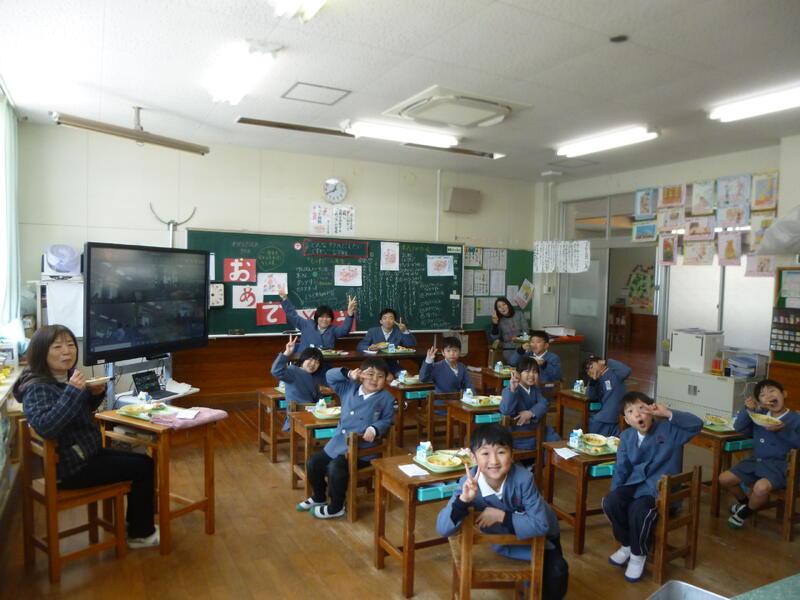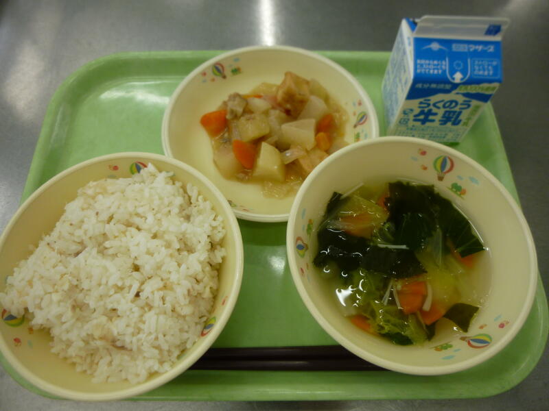 今日は鶏肉と卵の入った親子煮です。新じゃがや新玉がたっぷり入った煮物です。他にも出汁のしみこんだ高野豆腐が入っていました。これを食べた1年生の村本さんは「お肉だと思ったのに~」と残念がっていましたが、すかさず担任の山下先生が「畑のお肉ですよ」とフォローを入れてくださいました。1年生教室はいつも楽しそうです。