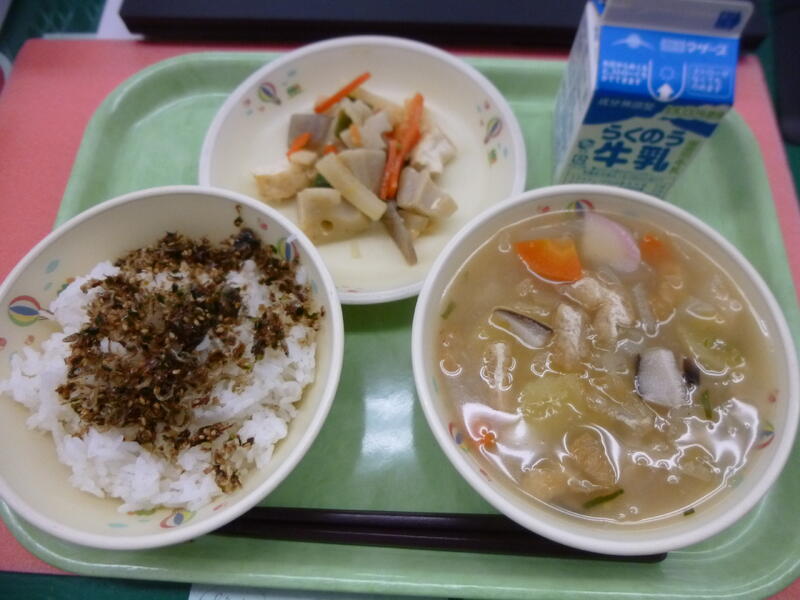 今日は春野菜がはいった味噌汁でした。「味噌汁に入っている春野菜はなんでしょう?」と尋ねて回りましたが、全問正解は6年生のみ!さすがです!味噌汁には南関あげを使っていましたが、「我が家の味噌汁にも使っています」と言う児童も。我が家の味噌汁の味や具を覚えていることは、実はとっても大切なことだと思います。これから先、自分で料理をする時にぜひ思い出してくれることでしょう!