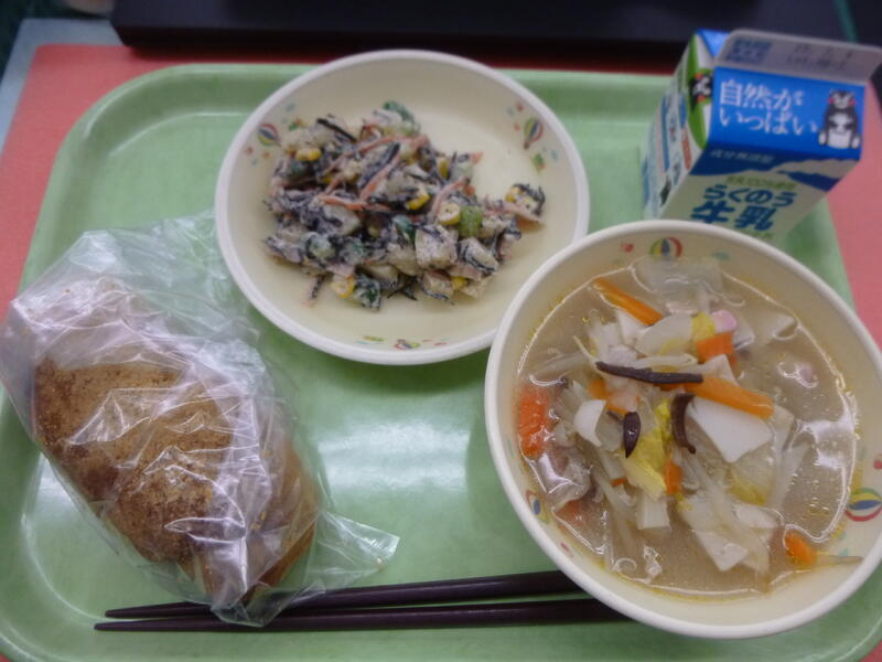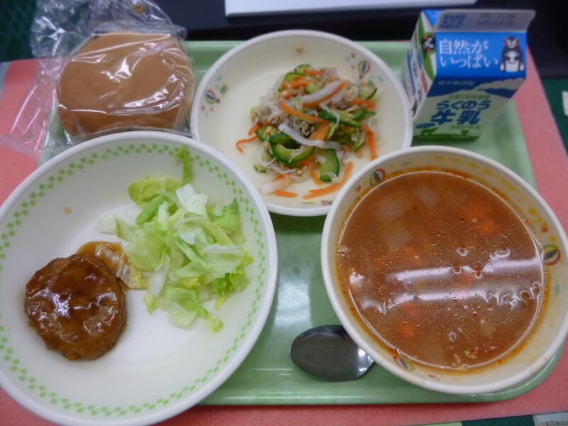 今日は熊本県の味です。県産の小麦粉をつかった「ひのくにパン」、郷土料理の「タイピーエン」、県産のキャベツやきゅうりを使った和え物が登場しました。郷土料理といえば「だご汁」「いきなり団子」などは思いつきますが、なかなかタイピーエンは思いつかなかったようです。もりもり食べて、しっかり覚えましょう。