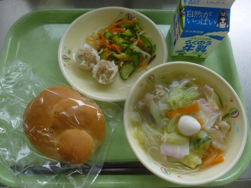 白菜に大根、人参、長ねぎなど冬が旬の野菜がたっぷり入った味噌汁は具だくさんで栄養満点です。また、大根は天草産、人参や白菜は熊本県産のものを使っています。地元の旬の食べものを味わいましょう。