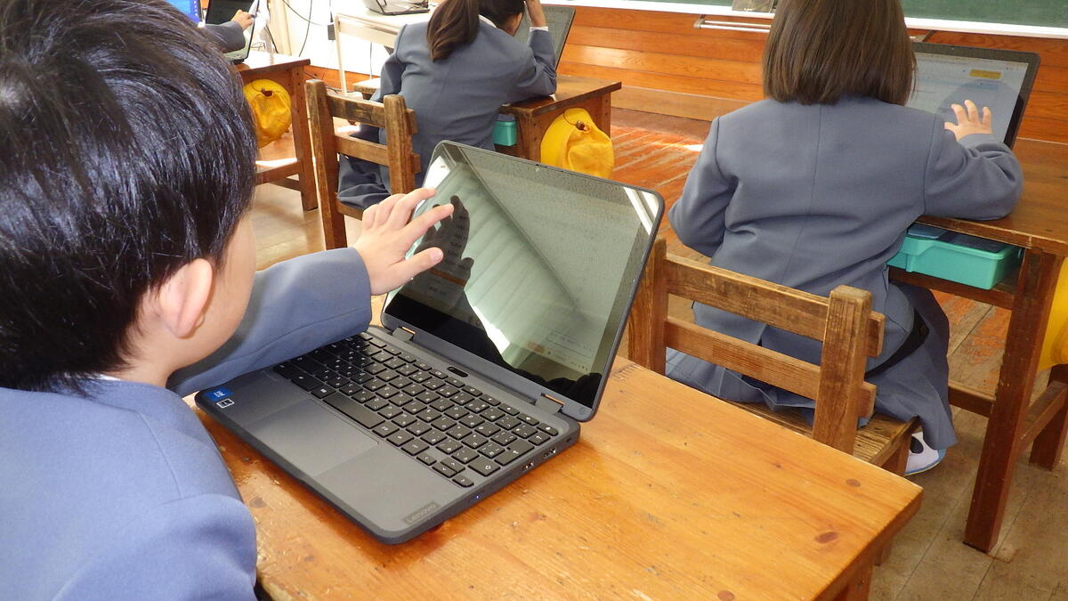小笠原諸島、新島、北海道、新山などの火山関連キーワードを基に、インターネットで調べてノートに記入し、更にはロイロノート(※)でレポートを作成する、という流れで取り組んでいました。これまでの積み重ねにより、タイピングも速くなり、黙々と学習を進める子供たちの姿がありました。