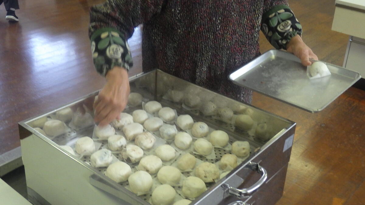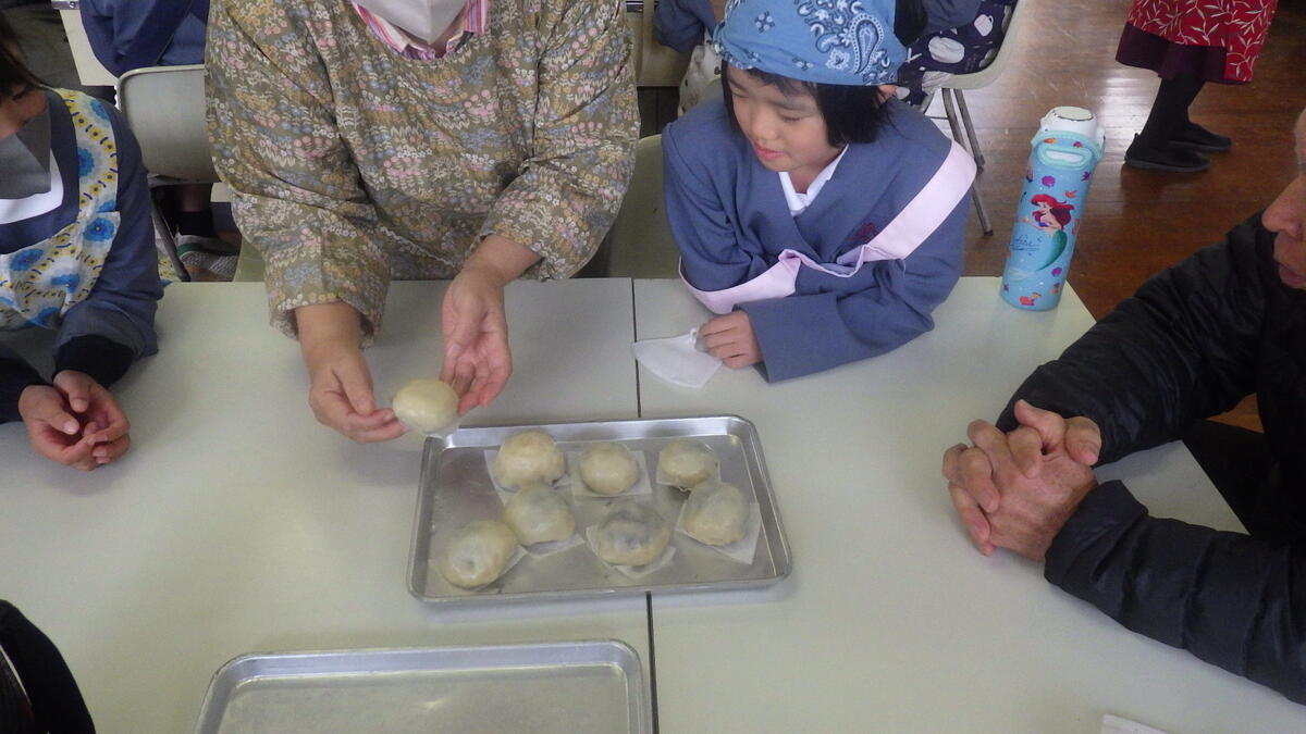 子供たちにとっては初めてですので、今日は地域ボランティアの方々においでいただき、あんの丸め方から生地のこね方、あんやいもの包み方まで手取り足取り教えてもらいました。また、いもは先日収穫したからいも(だけでは足りないので別に準備いただいたからいも)を使って作りました。