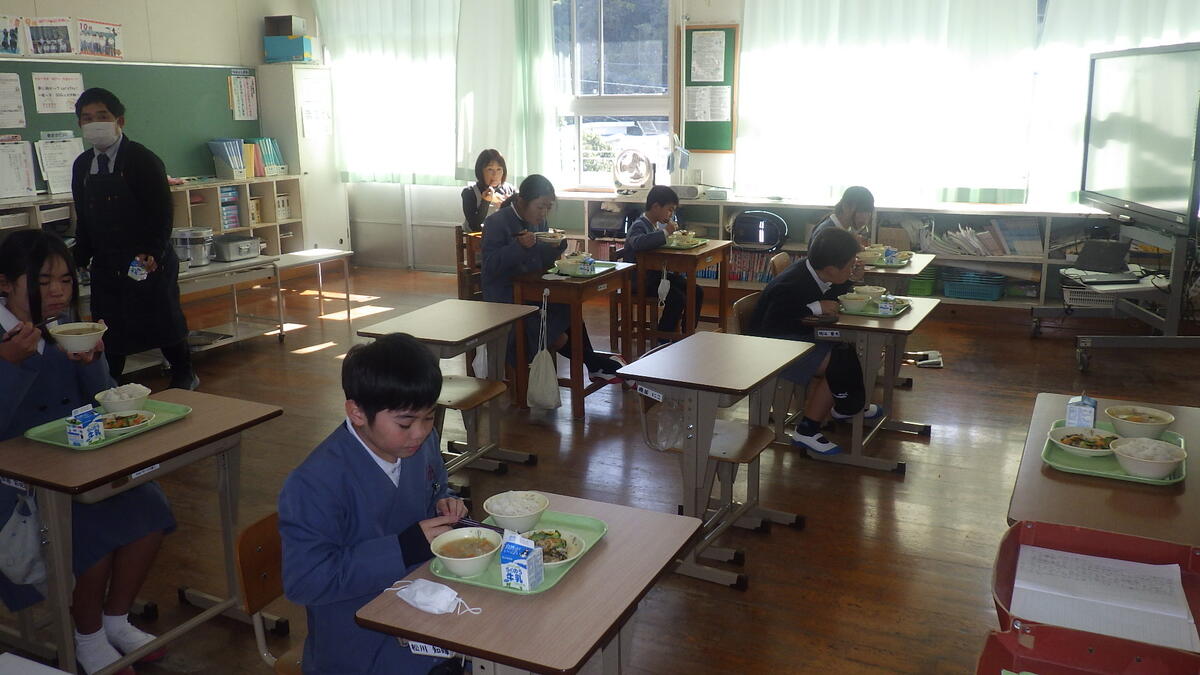 【6年教室】3人での給食。さびしい・・・(>_<)