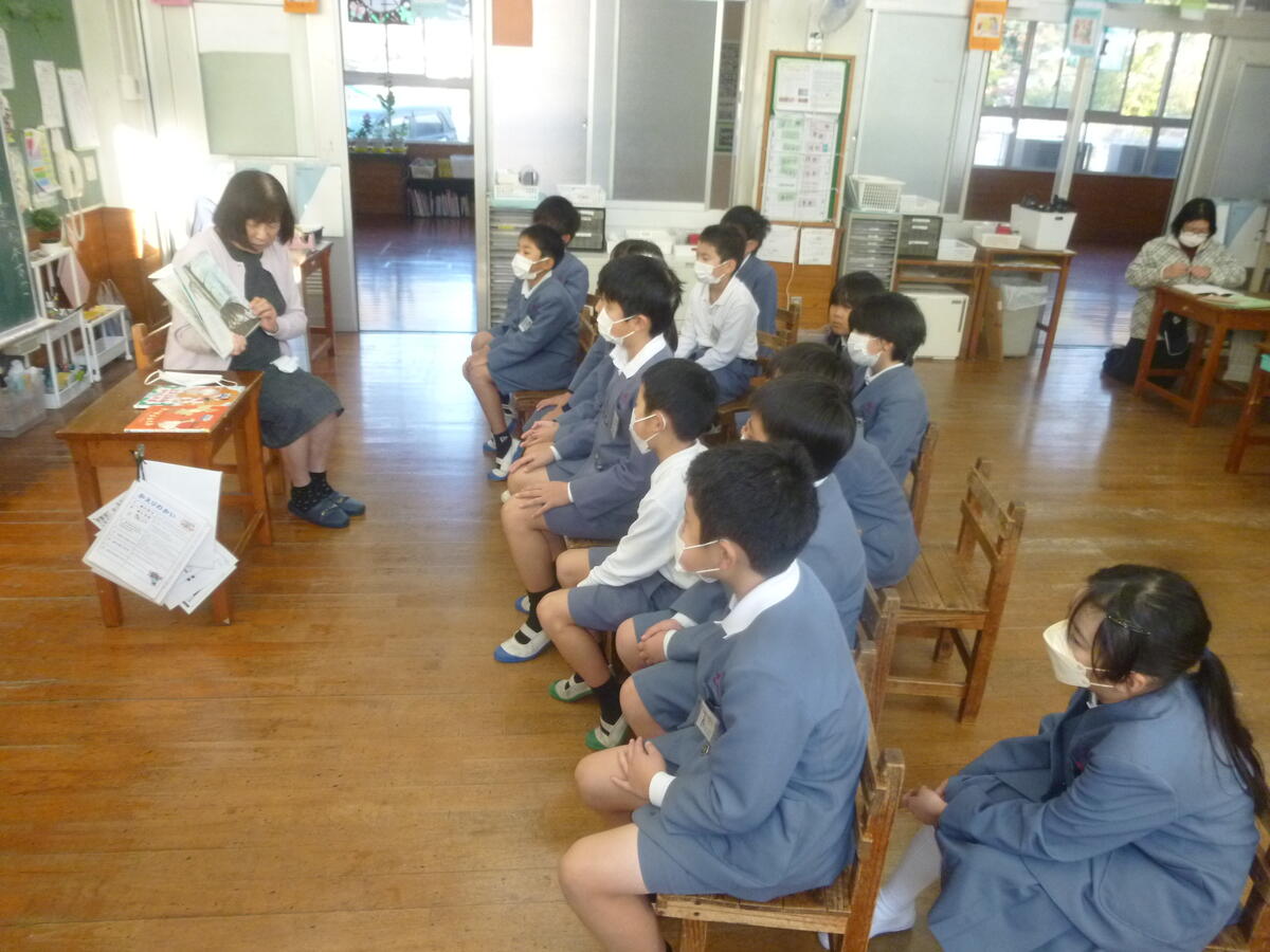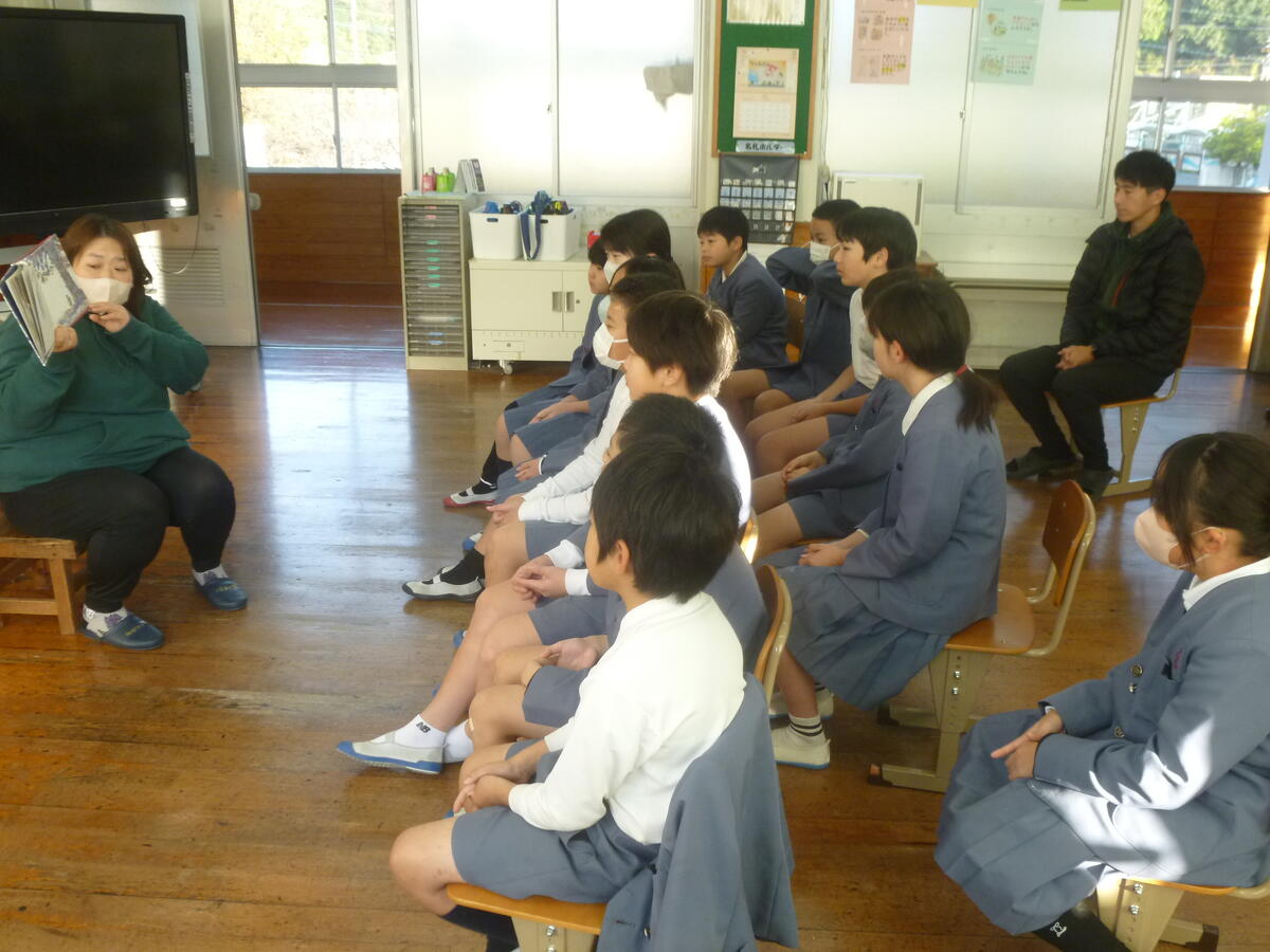 まず、朝の活動の時間には、2学期最後の読み聞かせがあり、4名の方にそれぞれの学年に応じた絵本の読み聞かせをしていただきました。