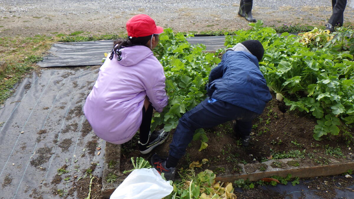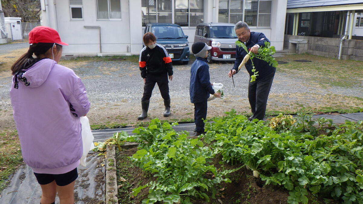 日本列島に襲来している " 最強、最長の寒波 " の影響もあり、今日は気温が上がらず寒い1日となりました。そんな中、3時間目には、わくわく学級の子供たちがこれまで育ててきた大根の収穫を行っていました。なかなか立派な大根がたくさんなっていました。