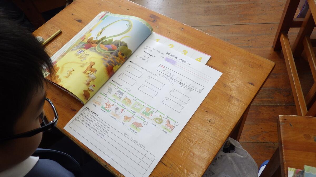 黒板には「Who are you?」と板書されています。今日の学習は「あなたは誰ですか。」の聞き方・答え方、並びに干支の動物を覚えるという内容でした。