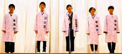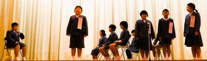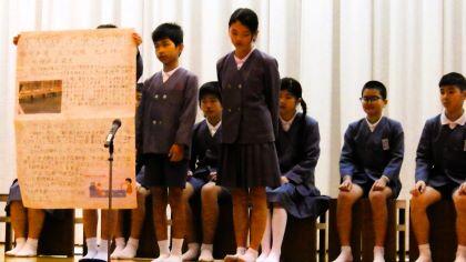 6年生は「永井 隆博士~平和への祈り~」と題し、原子爆弾に妻や同僚を奪われた永井博士の、それでも、我が子の未来と世界平和のために、必死に生き抜いた姿を発表しました。子ども達の真剣な表情と迫真の演技に思わず引き込まれ、目頭が熱くなりました。