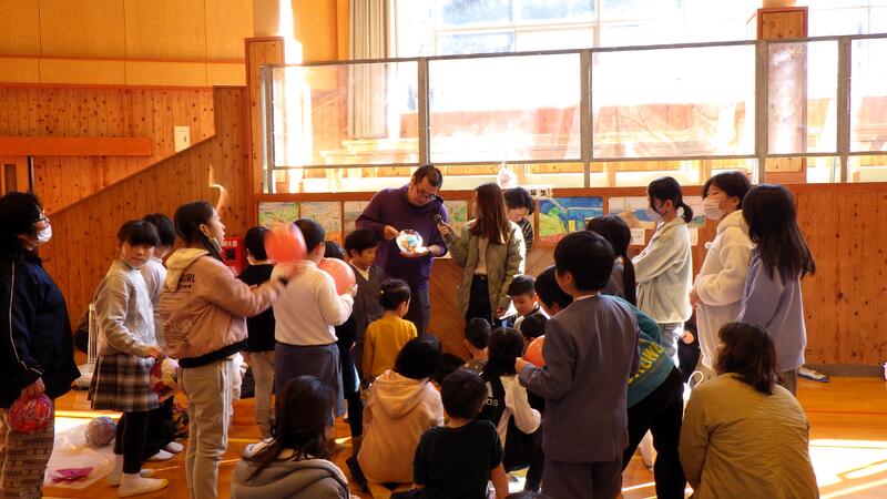「みんなで、もっとふれ合おう、もっと楽しもう!」をスローガンに、糸や和紙で作るランプシェード【作る活動】とグラウンドゴルフ大会【動く活動】に分かれて、親子や兄弟、地域の方との交流を楽しみました。