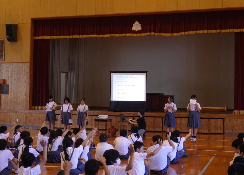 下の写真は、本研究の取組の一環として行っている「健康集会」(第3回:6月13日実施)のようすです。歯・口の健康づくりに関する基本的知識の定着を図るとともに学習内容についての児童の発表の場とすることを目的として取り組んでいます。運営、保健、放送、環境・栽培、体育、図書、給食の各委員会の子供たちが各月のテーマに沿って発表します。
