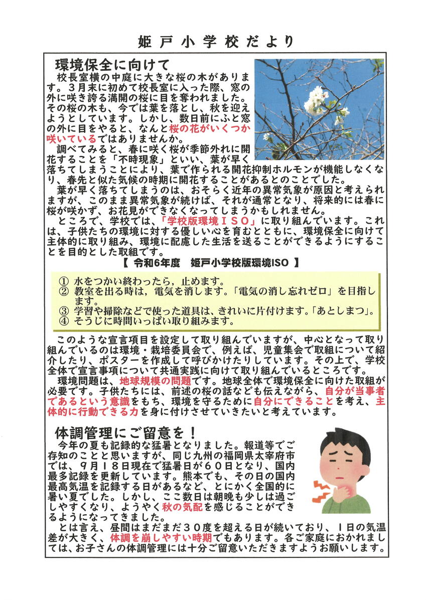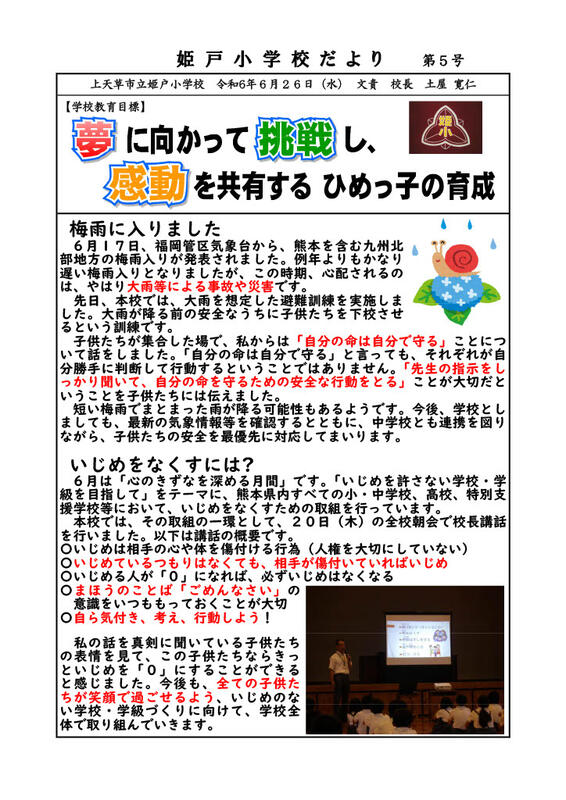 これから1年間、学校教育目標とひめっ子合言葉を常に意識しながら学校生活を送ることで、姫戸小をよりよくしていってくれることを期待しています。