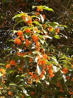 下の写真は金木犀(キンモクセイ)。十数年前に、ある公園で小山のような巨木を見つけて以来、毎年決まったように眺めに行きます。枝全体に黄金をちりばめたような金木犀が爽やかな秋の青空を背景にゆったりと繁り、辺りを包み込む甘い香りが心地よく、しばらくぼぉ-っと見上げていました。人間の目には「補色調和」という性質があって、補色同士だとより鮮やかに見えます。青の補色は黄色~オレンジ色。紅葉の山と青空という組み合わせは、絶好の被写体のようです。