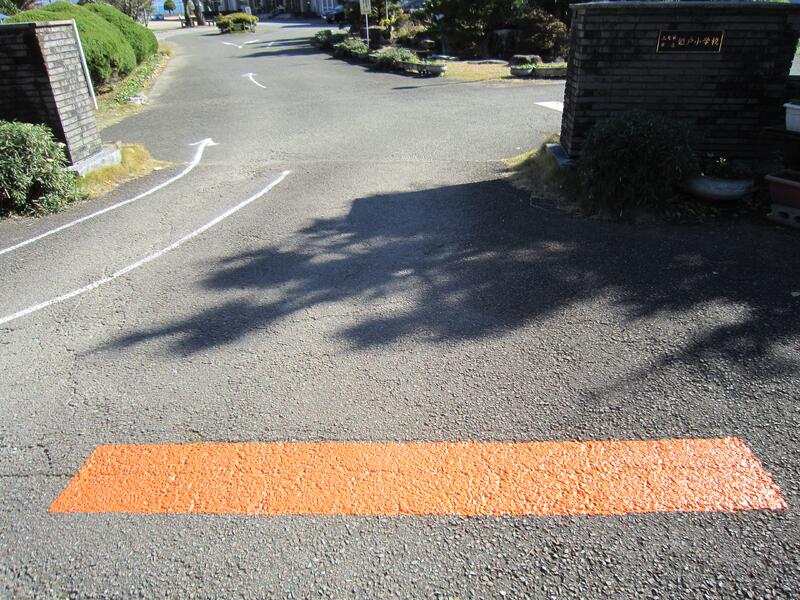 上の写真は、学校の正門前にあるオレンジ色の「停止線」です。毎日、子ども達の登下校の見守りをしていただいている 田中 道範 さん(上天草市社会教育委員長・子供会連絡協議会長)が、お忙しい中にペンキで丁寧に描いてくださいました。