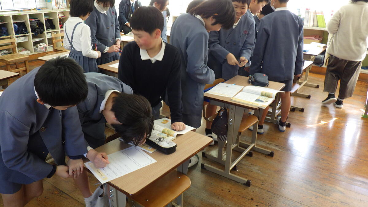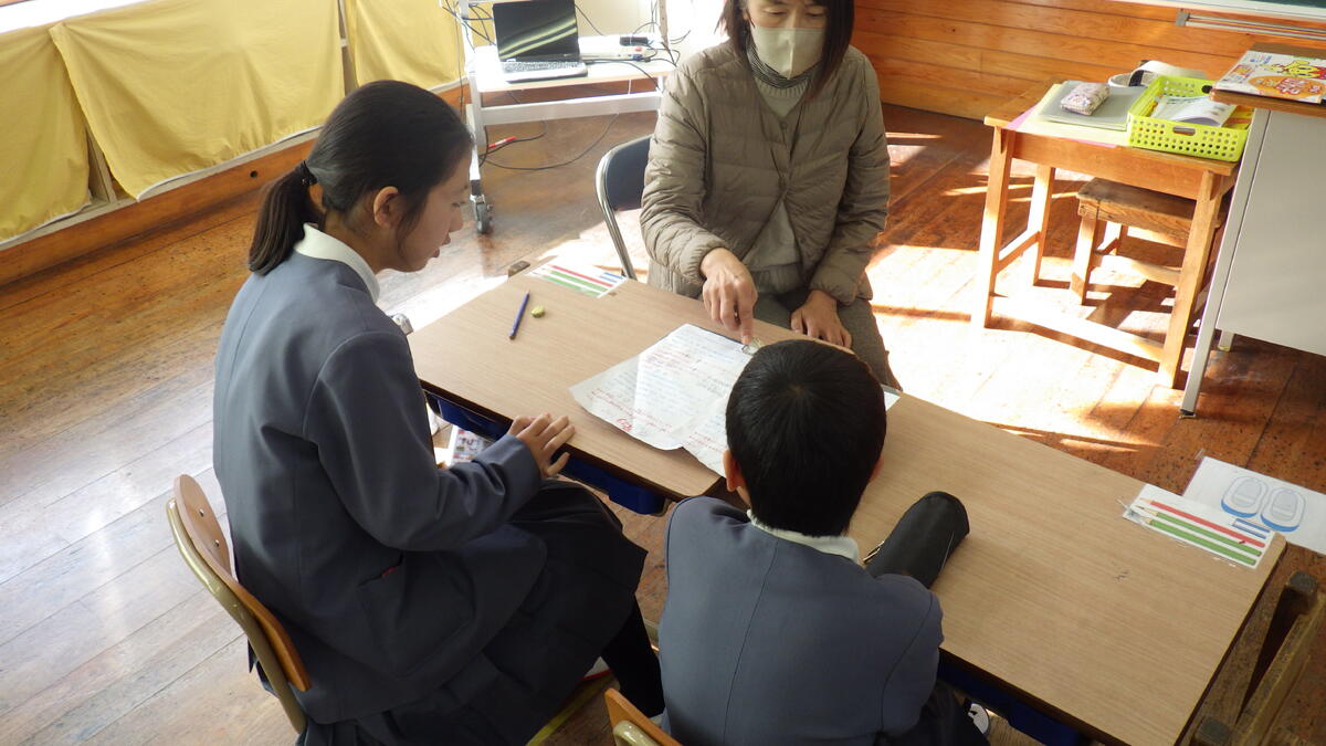 2・3年は国語の授業でした。2年は「スーホの白い馬」という単元で、3年は「もちもちの木」という単元で、いずれも感じたことを進んで共有し、一番心を動かされたところを伝える内容でした。複式学級としてスタートし、10ヶ月が過ぎましたが、学習リーダーを中心に落ち着いて、しっかりと学習していました。子ども達の成長ぶりに感心しました。