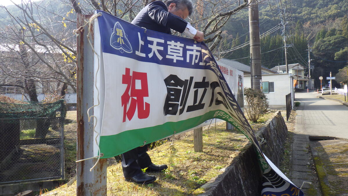 "最後の日" ということで、この1年間、校門付近に設置していたのぼり旗と横断幕を外しました。作業をしている教頭先生の表情がどことなく寂しそうに見えるのは気のせいでしょうか・・・ (^_^)