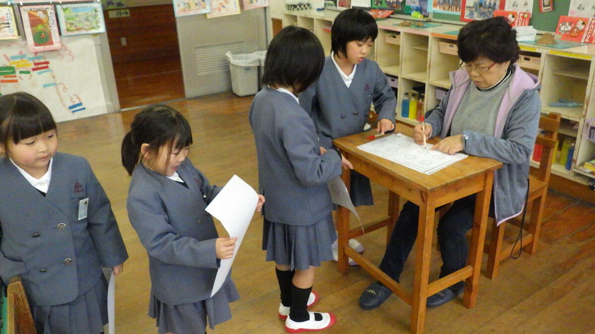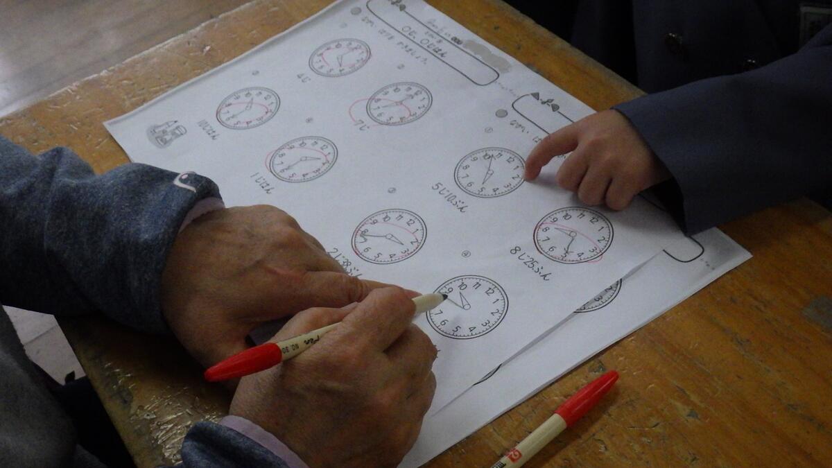 1年教室では、算数の「時刻」の学習に取り組んでいました。プリントの問題を解き、できたら地域ボランティアの方のところに持って行って丸を付けてもらいます。丸じゃないときもありますが・・・(^_^;)