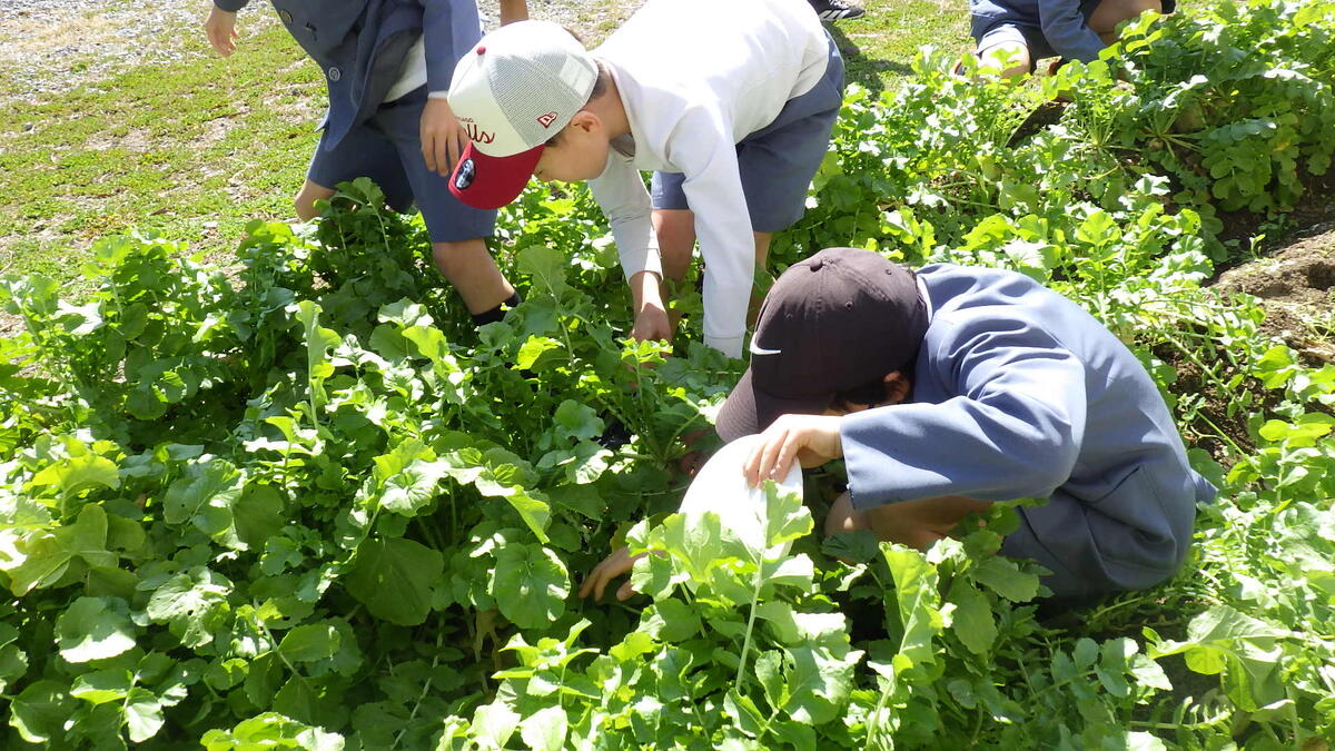 実はこれ、大根の収穫のために集まっていたのです。畑になった大根を1人1本引き抜いて持って帰れるとあって、子供たちはやる気満々! 15秒間でどれを引き抜くか決めた後はそれを引き抜くだけです。