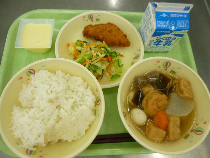 ☆ご飯 ☆牛乳 ☆おでん風煮 ☆ホキフライ ☆即席漬け ☆プリン