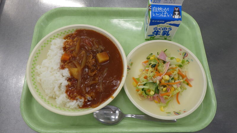 今週の献立のテーマは「熊本を味わおう」です。1日目の今日は、熊本県の小麦をつかった「ひのくにパン」と、給食でも人気メニューの郷土料理「タイピーエン」、熊本県産のキャベツをたっぷり使った「肥後ぎょうざ」でした。