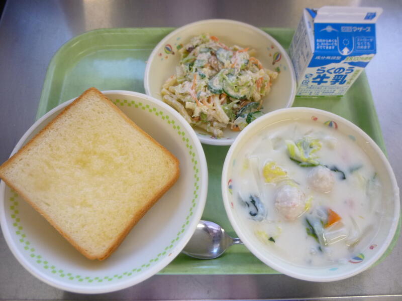 今日の献立:丸パン 牛乳 肉団子と白菜のスープ じゃこナッツサラダ スイートポテト