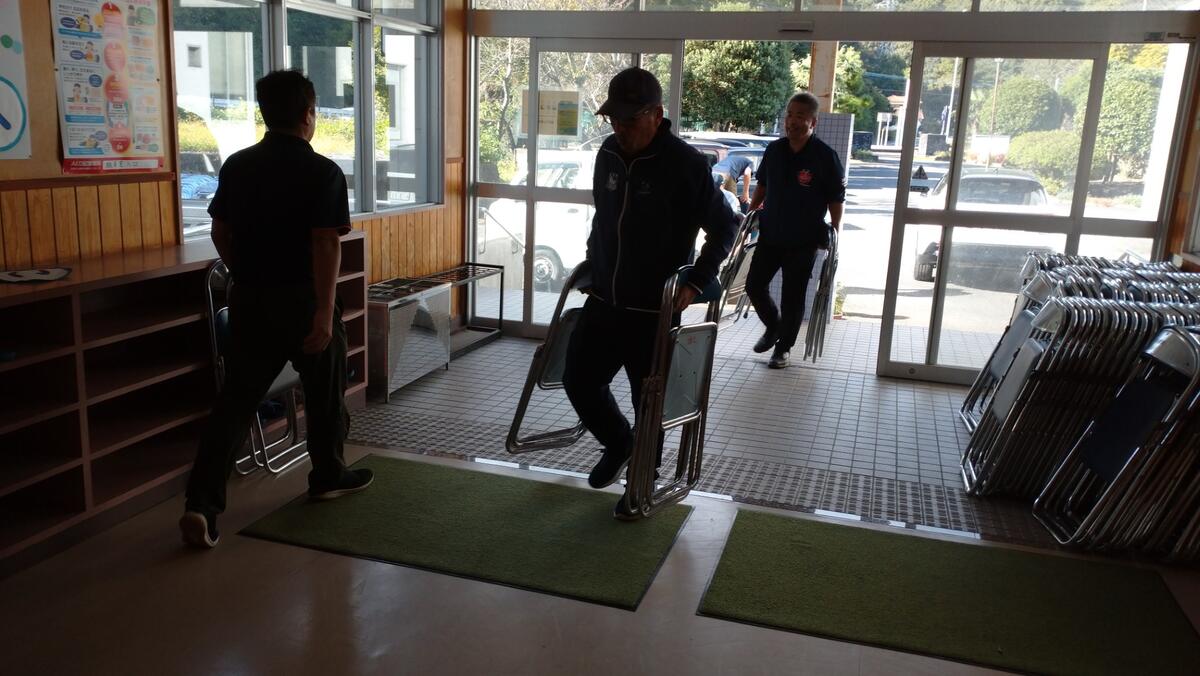 今日、椅子の運び込みを行いました。合わせて200脚の椅子を運ぶとなると、なかなか大変な作業ですが、地域の方、統括支所の方、それに中学校の先生方にもお手伝いをしていただきました。お陰さまで、あっという間に作業は終わりました。