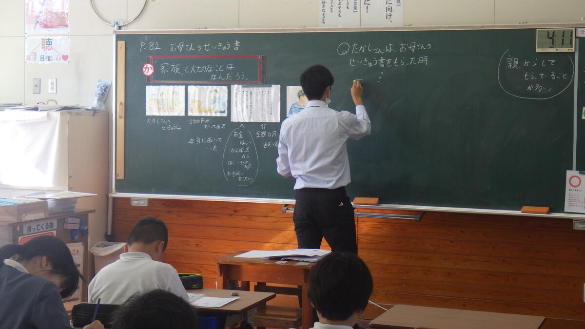 授業は「お母さんのせいきゅう書」という教材を使い、子供たちが「家族で大切なことは何だろう」という学習課題に沿って考える内容でした。