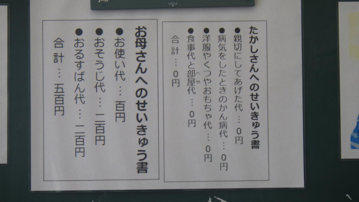 子供たちは、お母さんからの「0円」の請求書について、その意味を自分なりに考えながら、自分の思いを書いていました。