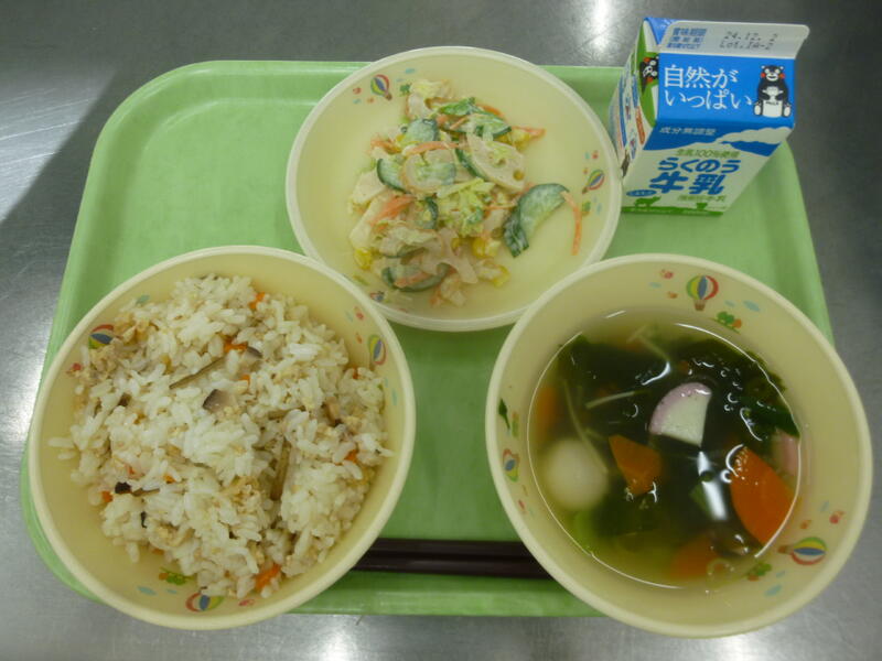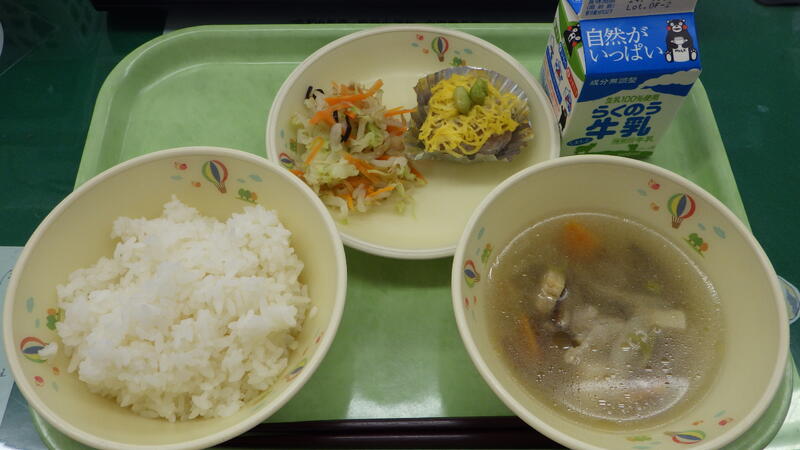 ☆教良木ご飯 ☆鶏ごぼう汁 ☆菊花しゅうまい ☆昆布あえ