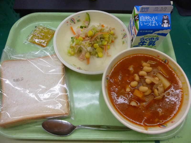 今日は大豆がゴロゴロッと入ったポークビーンズです。和食のイメージがある大豆ですが、給食では様々な形で献立で登場します。大豆は給食室で炊きますが、ちょっと固めに煮ることで、よく噛んで食べ、大豆の味や食感が伝わるように工夫しています。