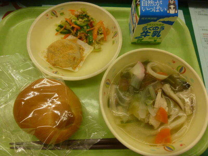 今日は熊本県産の小麦粉や白玉粉が登場しています。ひのくにパンはその名の通り、熊本県産の小麦粉100%使用されています。また、うどん麺も熊本県産小麦で作られています。また、大豆もちの白玉粉は熊本県産のもち米を使用してあります。給食ですすめる「地産地消」を子ども達にも伝えているところです。