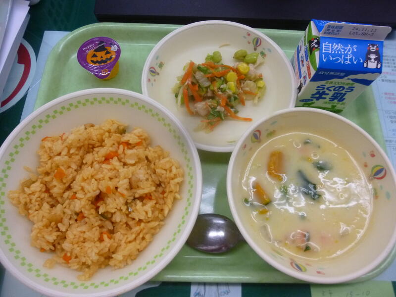 ☆チキンライス ☆牛乳 ☆パンプキンスープ ☆チキンサラダ ☆ハロウィンゼリー