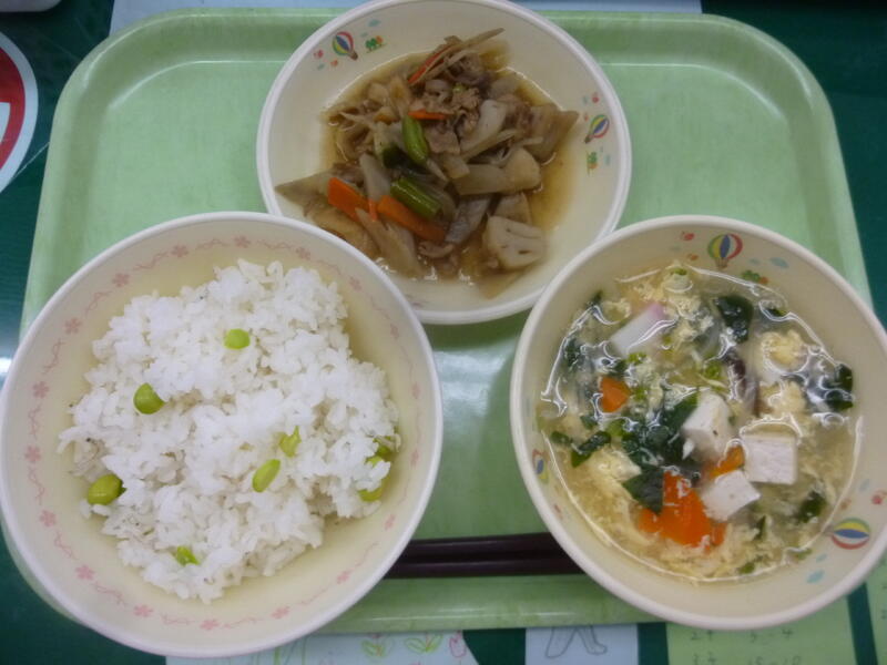 ☆枝豆とシラスのかみかみご飯 ☆牛乳 ☆かきたま汁 ☆ごぼうの甘辛煮