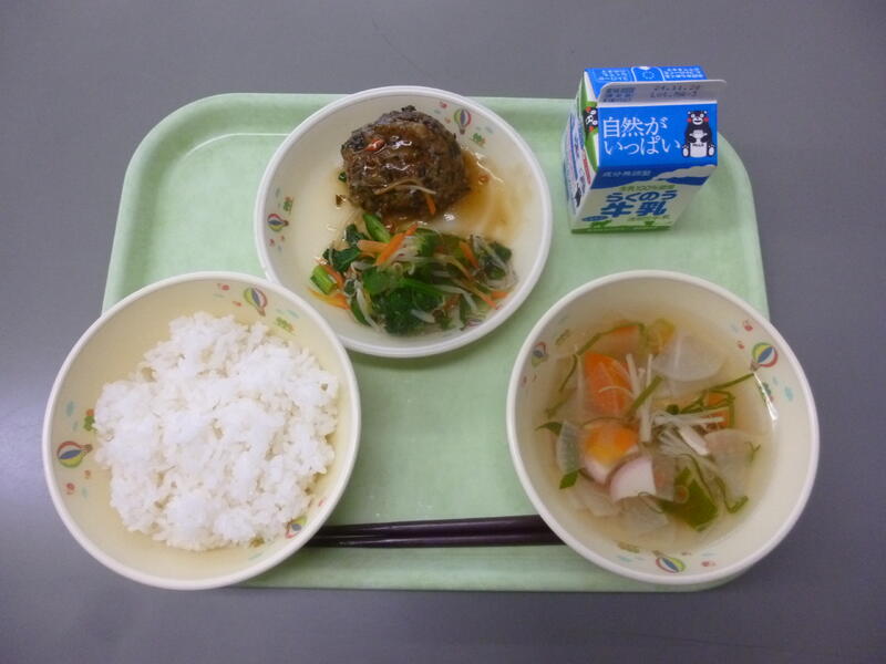 ☆教良木ごはん ☆牛乳 ☆いちょう葉汁 ☆豆腐とひじきのハンバーグ ☆小松菜のちりめんあえ