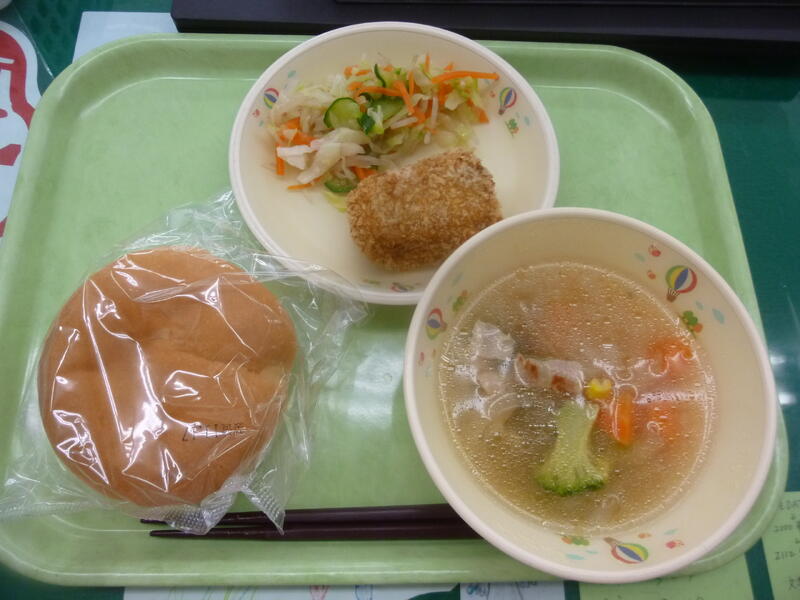 ☆丸パン ☆牛乳 ☆コンソメスープ ☆てづくりコロッケ ☆そえ野菜