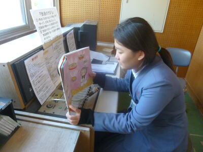 給食時間には、図書委員会の5年濱本さんが絵本の一部を朗読し、紹介しました。