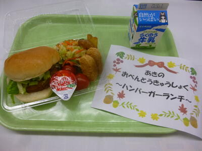 今日は4・5・6年生は郡市音楽会へ参加のため給食がなかったため、お留守番の1・2・3年生は秋のお弁当給食でした。ハンバーガーランチとして、野菜サラダにチキンナゲット、ミニトマト、りんごゼリーを詰め込んだお弁当です。