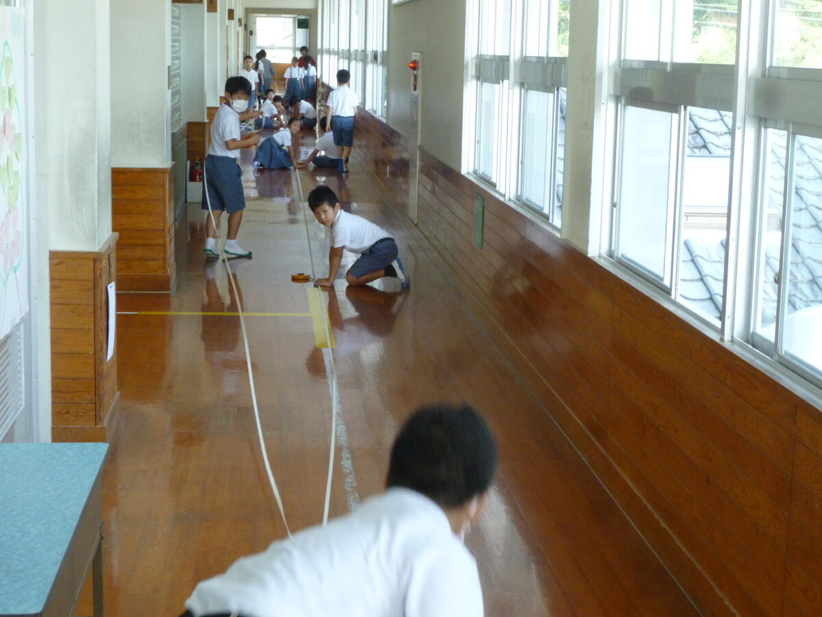 何をしているかと言いますと、算数の学習です。3年生は現在、算数で「長さ」の学習をしており、廊下の長さを巻尺を使って測っているところでした。いわゆる「算数的活動」です。