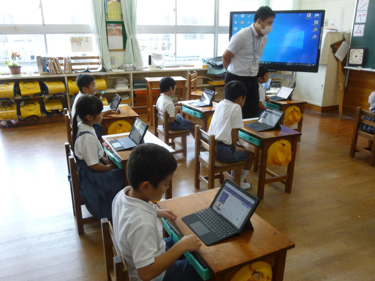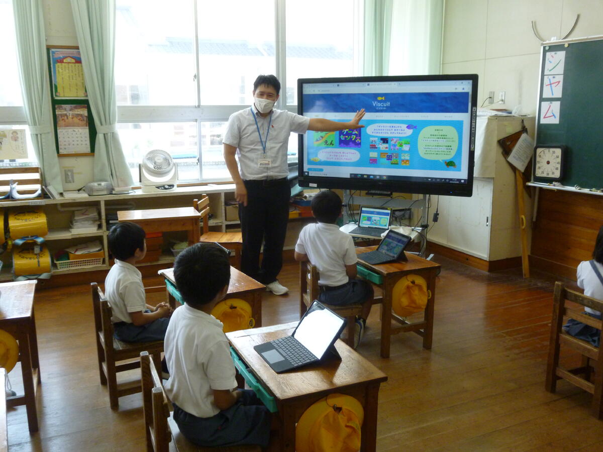 上の写真は、ICT支援員の濵先生が、1年生にタブレットPCの使い方について説明されているところです。濵先生は月に数回各学校を回り、子供たち及び教員にICT活用における支援をされています。
