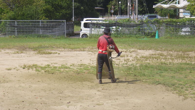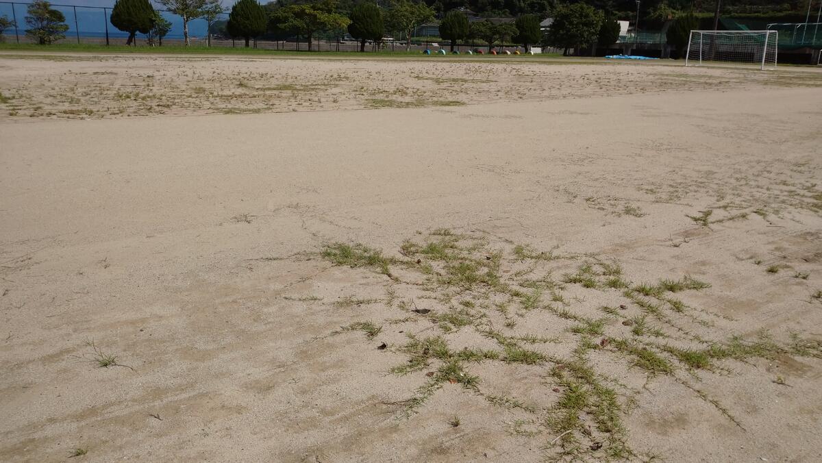 上の写真は、9月1日に運動場(保育園側)を写したものです。ほぼ全面に草が生えてしまっています。8月21日のPTA作業で、保護者の方々には除草にご協力いただきましたが、草が多すぎて太刀打ちできませんでした。