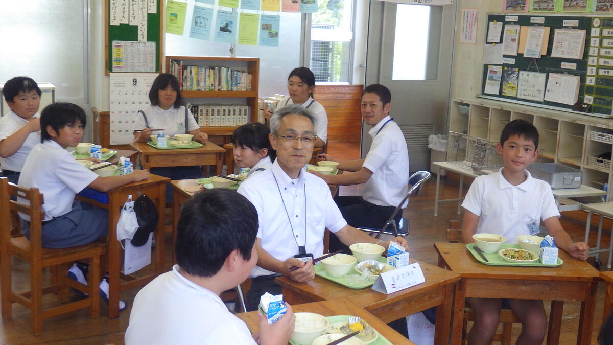 上の写真は、岩﨑教育長、山口教育委員と一緒に給食を食べている6年教室の様子です。子供たちは少し緊張気味でしょうか?(^-^;)