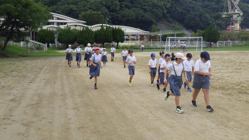 子ども達は、教室に入ると荷物を整理し、運動場に出て行きます。そして、音楽に合わせてランニング!!これからも、暑さに負けず元気に頑張ってほしいと思います。