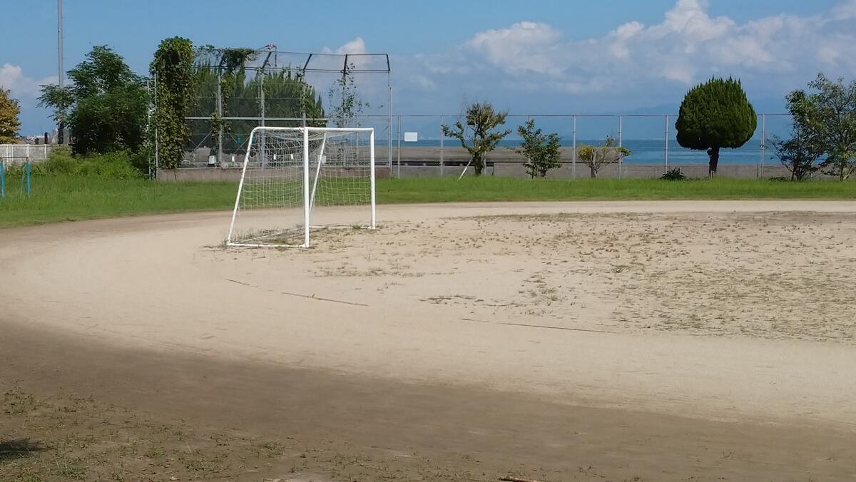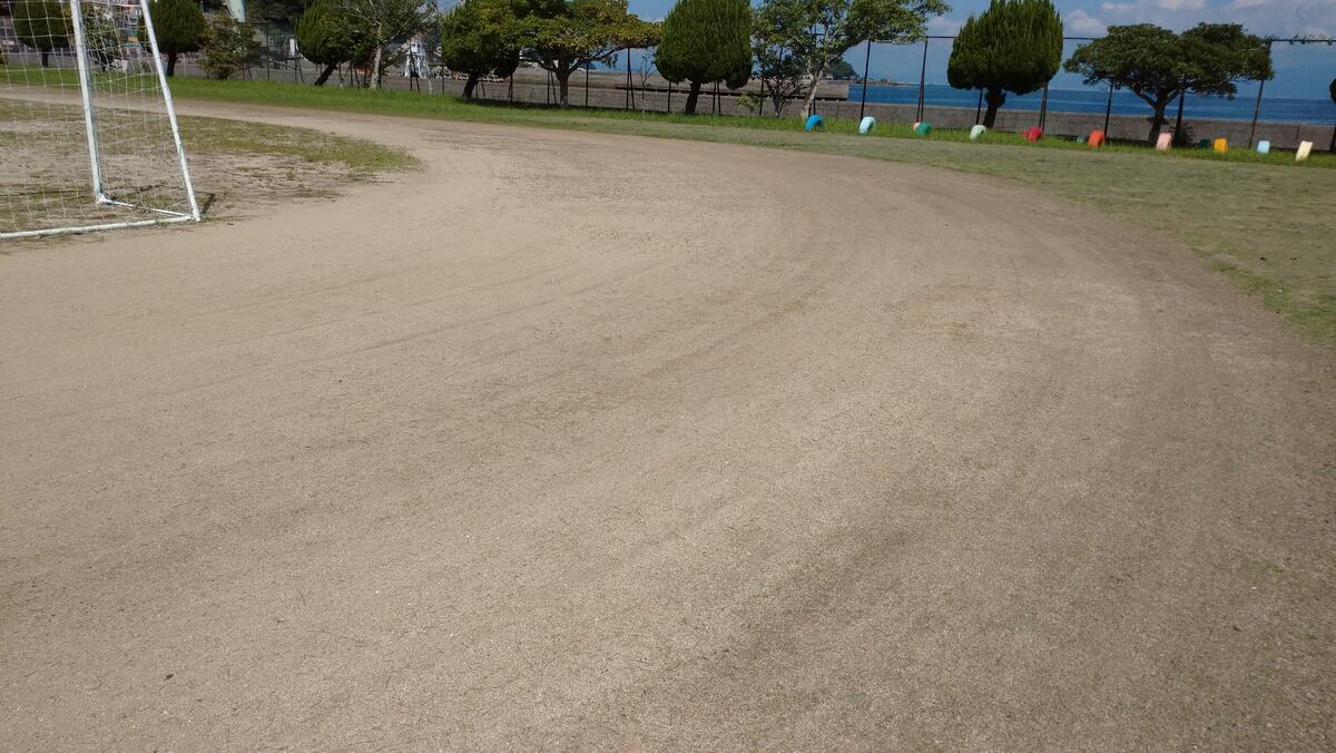 これはプール側です。こちらもトラックの部分はきれいになっています。実は、用務員の先生に毎日草を引いたり刈ったりしていただいて、ここまできれいになりました。本当にご苦労様です。