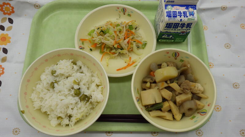 今日の献立:グリンピースご飯 牛乳 筑前煮 じゃこのごま酢和え