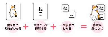 通常、人は上図のように「視覚イメージ」「単語」「語の組み合わせ」の3つの要素の重なりで語彙を身につけるそうです。視覚イメージと単語が結びついていないと「アレだよ、アレ。何て言ったっけ?」になり、単語と語の組み合わせが結びついていないと「ふんいき? ふいんき? どっちだっけ?」になります。